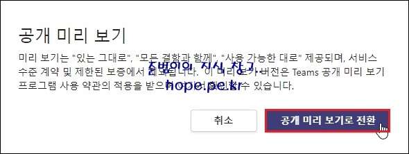 공개 미리 보기 창이 발생하면, 내용 확인 후 '공개 미리 보기로 전환' 을 클릭합니다.