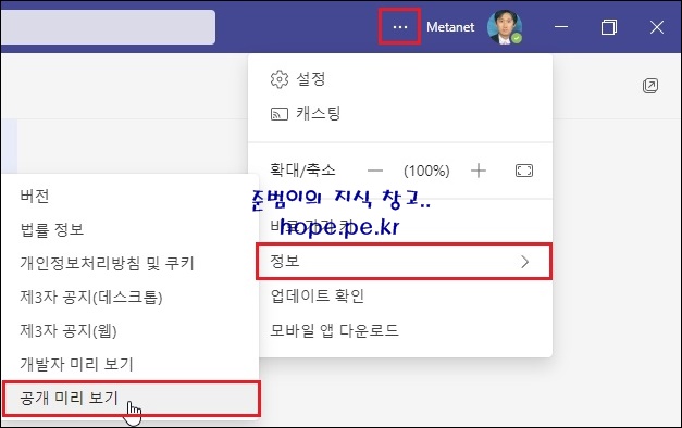 'Teams 설정 > 정보 > 공개 미리 보기' 를 클릭해보겠습니다.