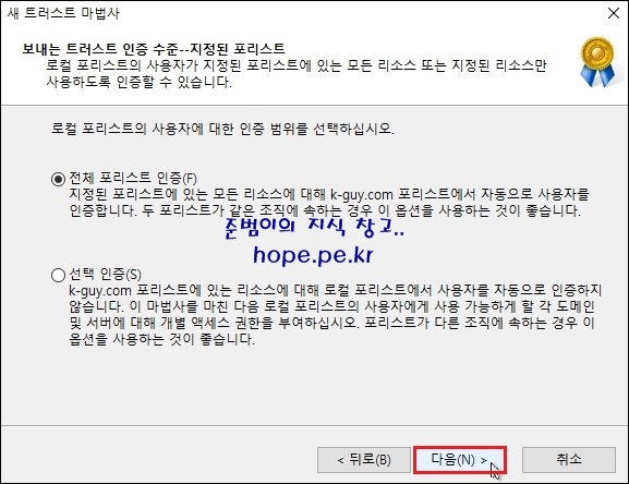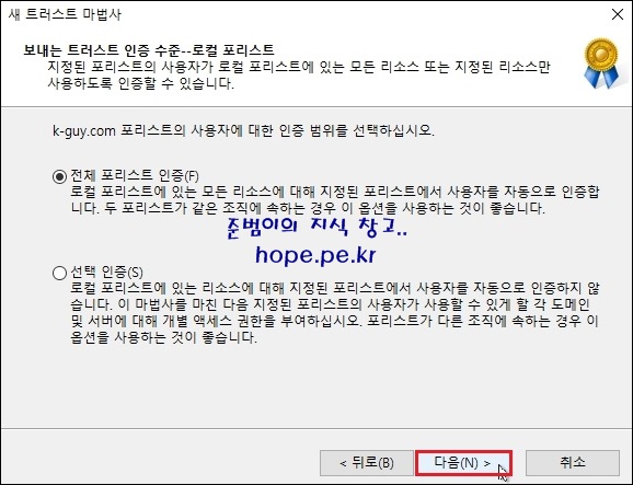 보내는 트러스트 인증 수준--로컬 포리스트 화면에서, '다음' 을 클릭 합니다.