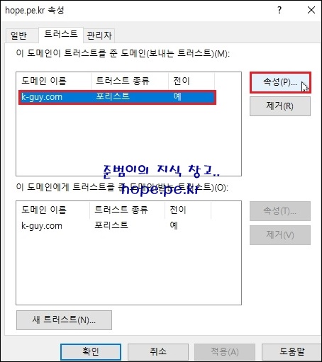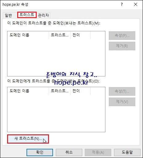 도메인 속성 창에서, '트러스트' 탭 클릭 후 '새 트러스트' 를 클릭 합니다.