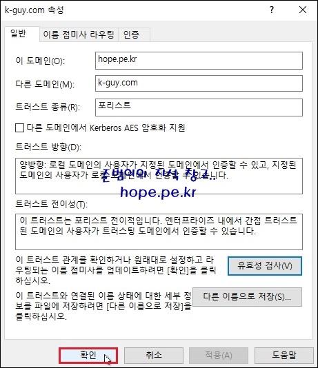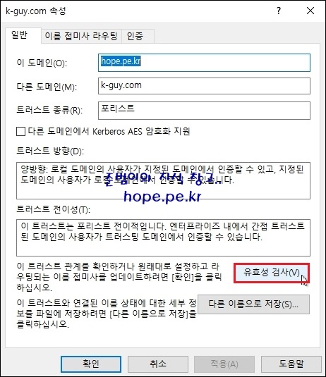 이 도메인에게 트러스트를 준 도메인(받는 트러스트)' 의 '속성' 을 클릭 후 동일한 방법으로 유효성 검사를 진행 합니다.