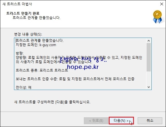 트러스트 만들기 완료 화면에서, 트러스트 관계가 정상적으로 만들어짐을 확인 후 '다음' 을 클릭 합니다.