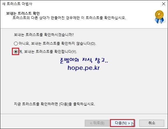 보내는 트러스트 확인 화면에서, '예, 보내는 트러스트를 확인합니다.' 선택 후 '다음' 을 클릭 합니다.