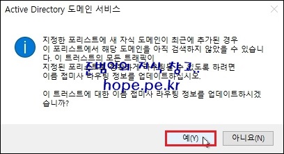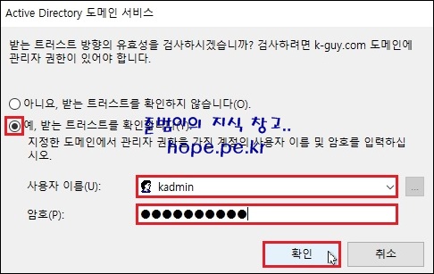 Active Directory 도메인 서비스 창에서, '예, 받는 트러스트를 확인합니다.' 선택 후 '트러스트 도메인의 관리자 계정 정보' 입력 후 '확인' 을 클릭 합니다.