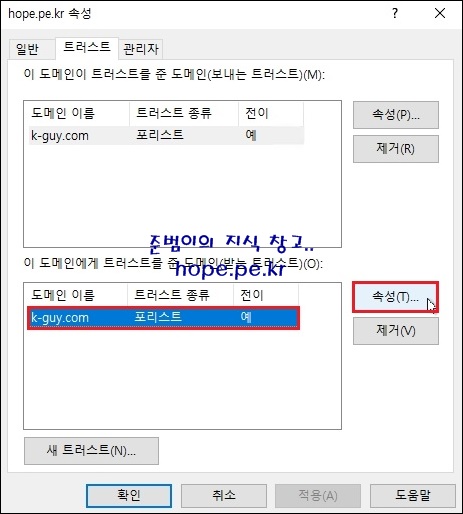 '이 도메인이 트러스트를 준 도메인(보내는 트러스트)' 의 '속성' 을 클릭 합니다.