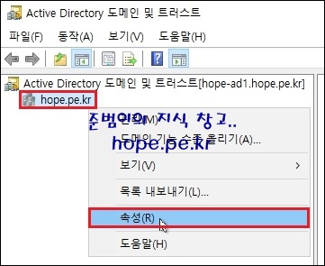'Active Directory 도메인 및 트러스트' 콘솔 실행 후, '도메인' 에서 우클릭 후 '속성' 을 클릭 합니다.