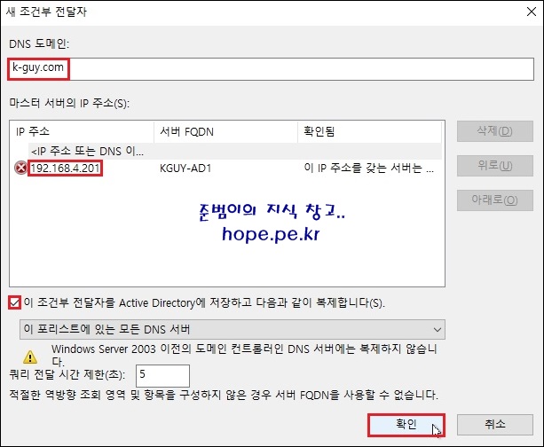 새 조건부 전달자 창에서, 'DNS 도메인' 입력 후 'IP 주소' 입력 후 '이 조건부 전달자를 Active Directory에 저장하고 다음과 같이 복제합니다.'에 체크 후 '확인' 을 클릭 합니다.
