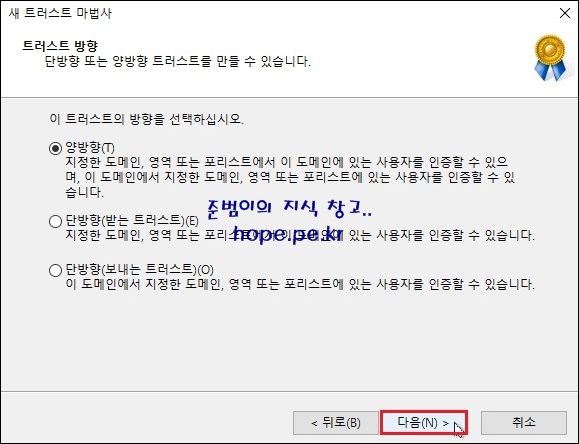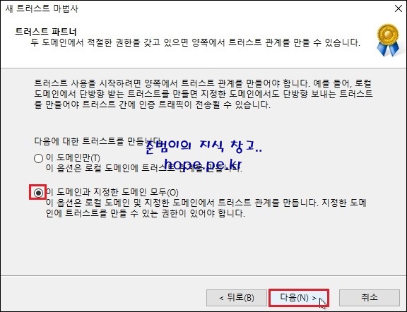 트러스트 파트너 화면에서, '이 도메인과 지정한 도메인 모두' 선택 후 '다음' 을 클릭 합니다.