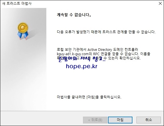 cf1) 조건부 전달자를 사전에 추가하지 않아 해당 도메인에 대한 조회가 안 될 경우에는 다음과 같이 '해당 도메인의 RPC 연결을 얻을 수 없습니다.' 라는 에러가 발생하며 트러스트 구성이 더 이상 진행되지 않습니다.