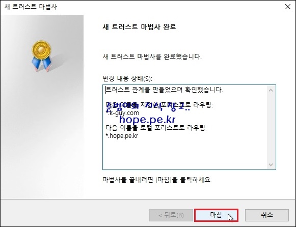 새 트러스트 마법사 완료 화면에서, '마침' 을 클릭 합니다.
