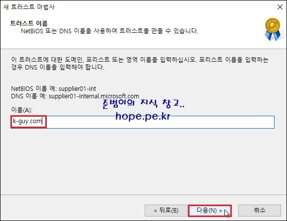 트러스트 이름 화면에서, 트러스트를 구성할 도메인의 'DNS 이름' 입력 후 '다음' 을 클릭 합니다.