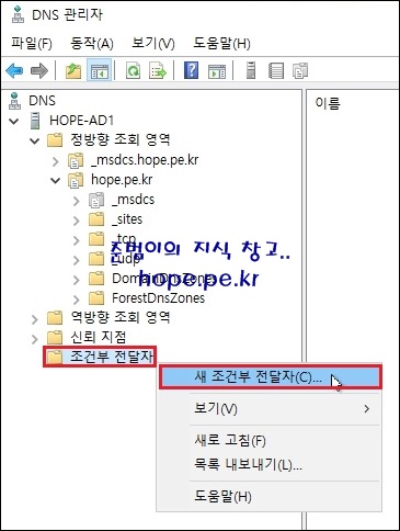 'DNS 관리자' 콘솔 실행 후, '조건부 전달자' 에서 우클릭 후 '새 조건부 전달자' 를 클릭 합니다.