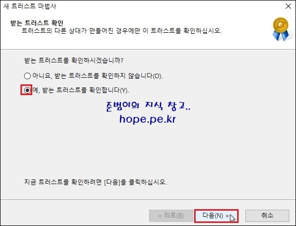 받는 트러스트 확인 화면에서, '예, 받는 트러스트를 확인합니다.' 선택 후 '다음' 을 클릭 합니다.