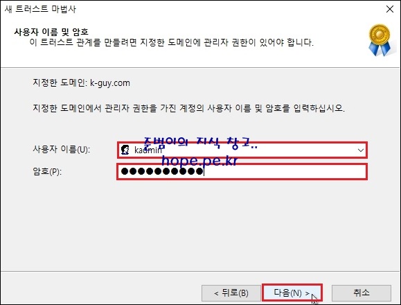 사용자 이름 및 암호 화면에서, 지정한 도메인의 관리자 계정의 이름 및 암호 입력 후 '다음' 을 클릭 합니다.