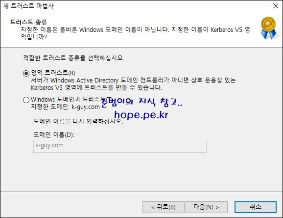 cf2) 트러스트 관련 포트가 정상적으로 열려 있지 않을 경우에는 다음과 같이 '지정한 이름은 올바른 Windows 도메인 이름이 아닙니다.' 메세지와 함께 트러스트 종류 선택 화면이 발생 합니다.