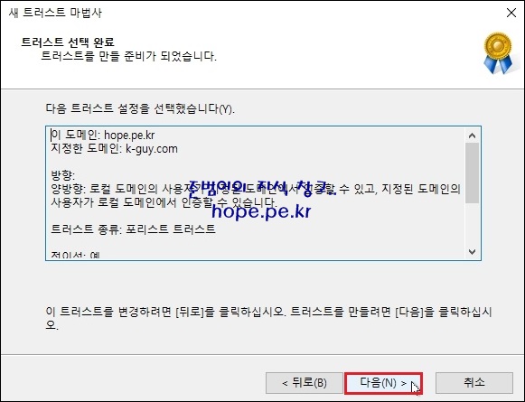 트러스트 만들기 완료 화면에서, 트러스트 관계가 정상적으로 만들어짐을 확인 후 '다음' 을 클릭 합니다.