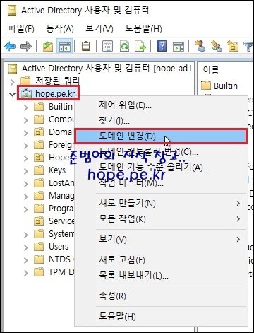 Active Directory 사용자 및 컴퓨터 콘솔 실행 후, '도메인' 에서 우클릭 후 '도메인 변경' 을 클릭 합니다.