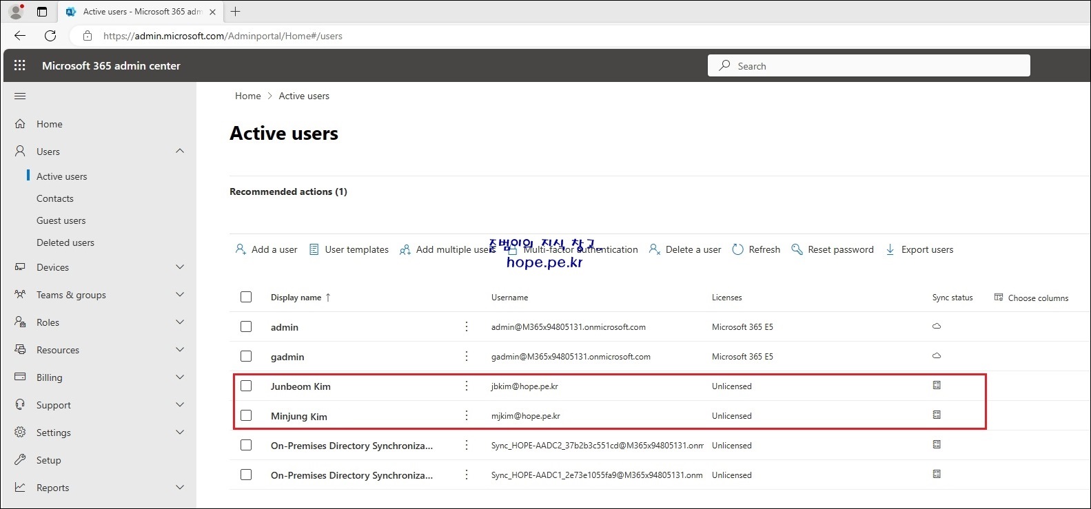 Microsoft 365 관리 센터 에서도 해당 사용자가 정상적으로 동기화 되었음을 확인할 수 있습니다.