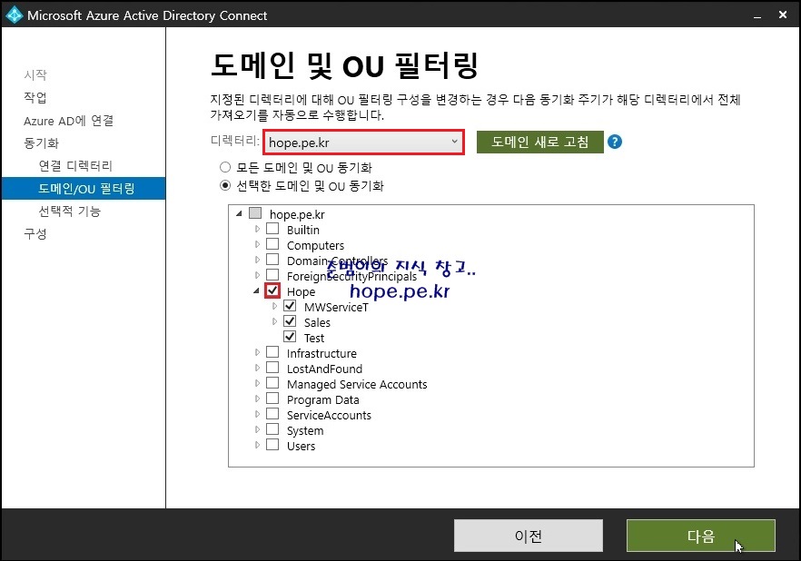 다음 스샷은 'hope.pe.kr' 도메인의 'Hope' OU 하위의 모든 개체들을 Microsoft Entra ID 와 동기화 하겠다는 의미 입니다.