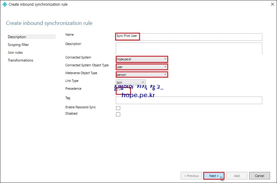 Description 메뉴 에서, 'Name' 에 '규칙 이름' 입력 > 'Connected System' 에 '도메인' 선택 > 'Connected System Object Type' 에 'user' 선택 > 'Metaverse Object Type' 에 'person' 선택 > 'Precedence' 에 '규칙 우선순위' 를 입력 후 'Next' 를 클릭 합니다.