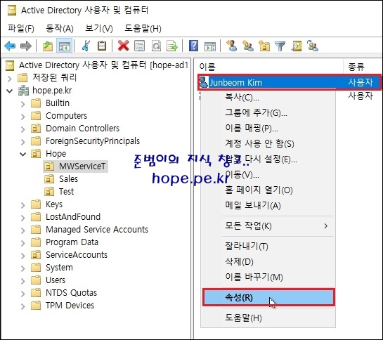 다음으로 'AD 서버로 이동 > Active Directory 사용자 및 컴퓨터 콘솔 실행 > 동기화 하고자 하는 사용자에서 우클릭 > 속성' 을 클릭 합니다.
