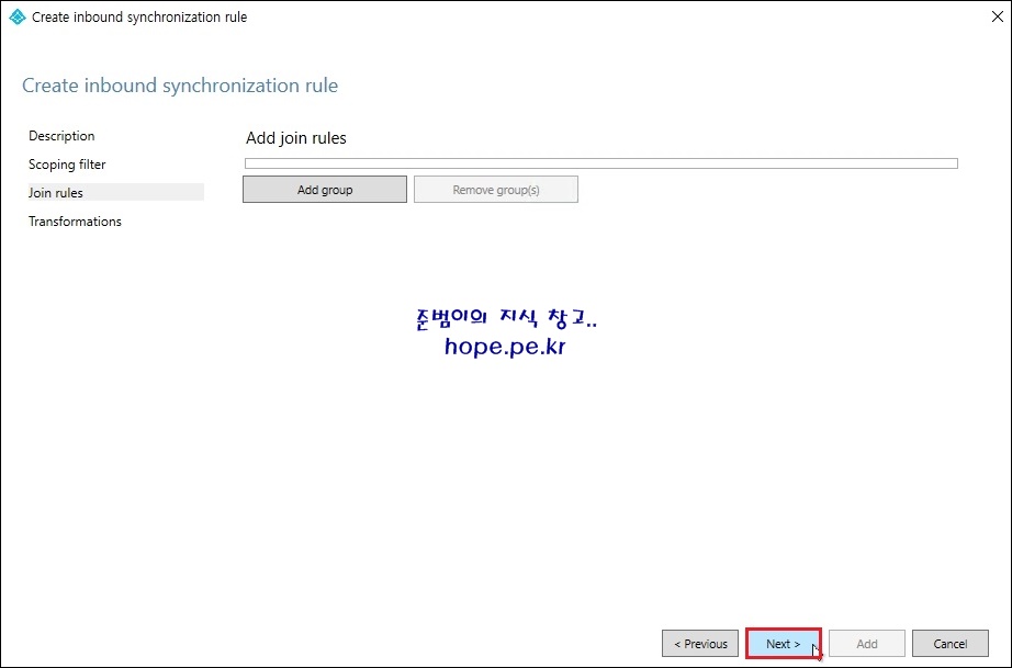 Join rules 메뉴에서, 'Next' 를 클릭 합니다.