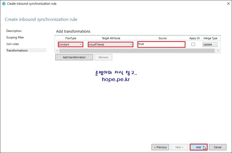 'FlowType' 에 'Constant' 선택 > 'Target Attribute' 에 'CloudFilteres' 선택 > 'Source' 에 'true' 입력 > 'Add' 를 클릭 합니다.