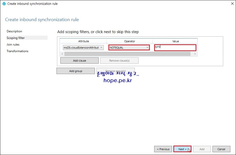 'Operator' 에 'NOTEQUAL' 선택 > 'Value' 에 'msDS-cloudExtensionAttribute7 특성에 입력한 문자열 Sync' 입력 후 'Next' 를 클릭 합니다.