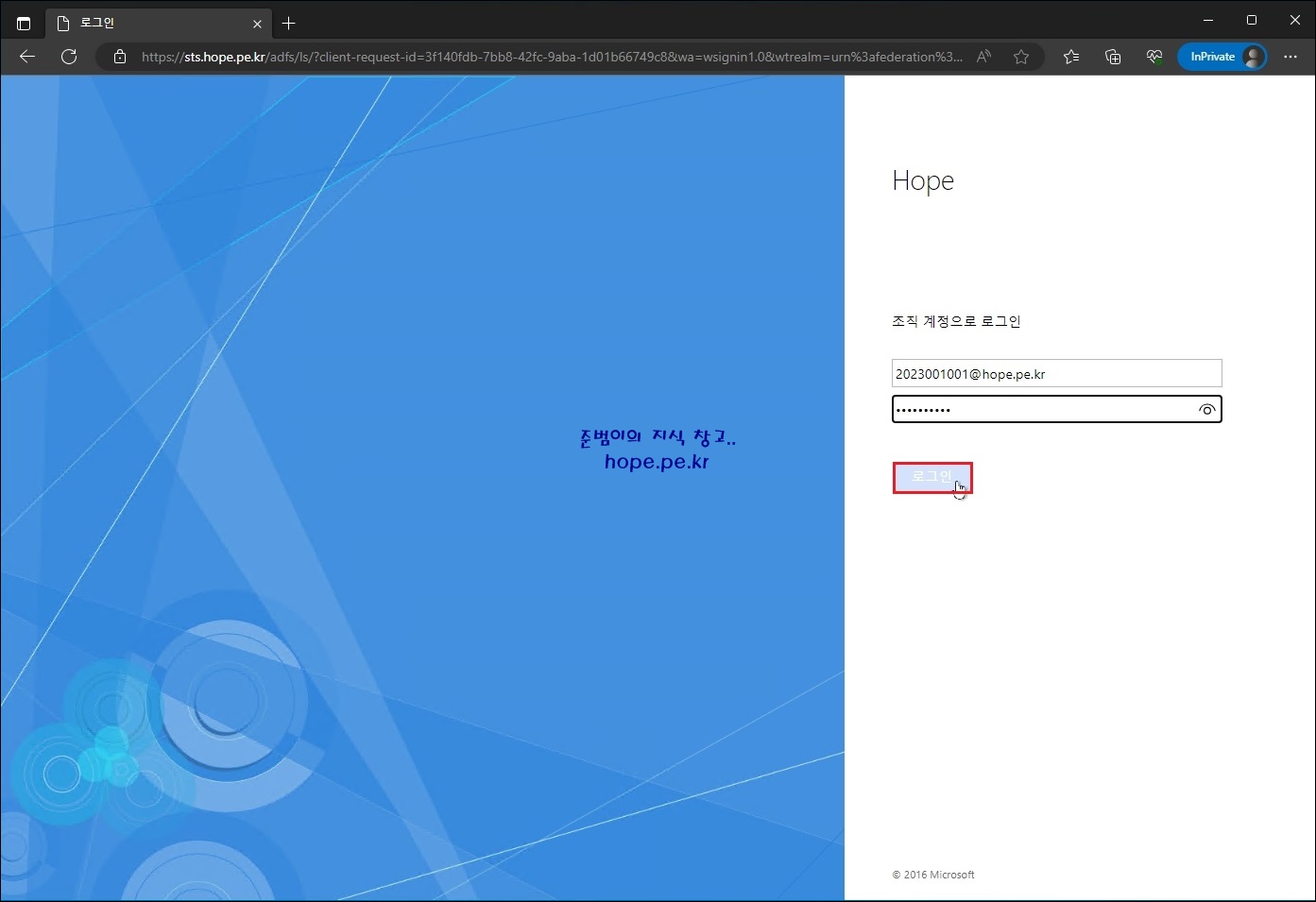 해당 도메인으로 Microsoft 365에 로그인을 시도하면 다음과 같이 ADFS 로그인 페이지로 이동됨을 확인 후 로그인을 진행합니다.