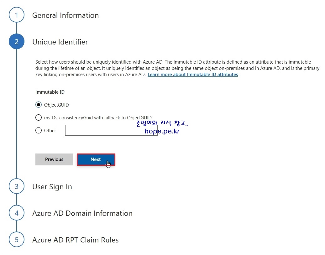 2) Unique Identifier 단계에서, 조직에서 사용하는 Unique Identifier 방법을 선택 후 'Next' 를 클릭 합니다.