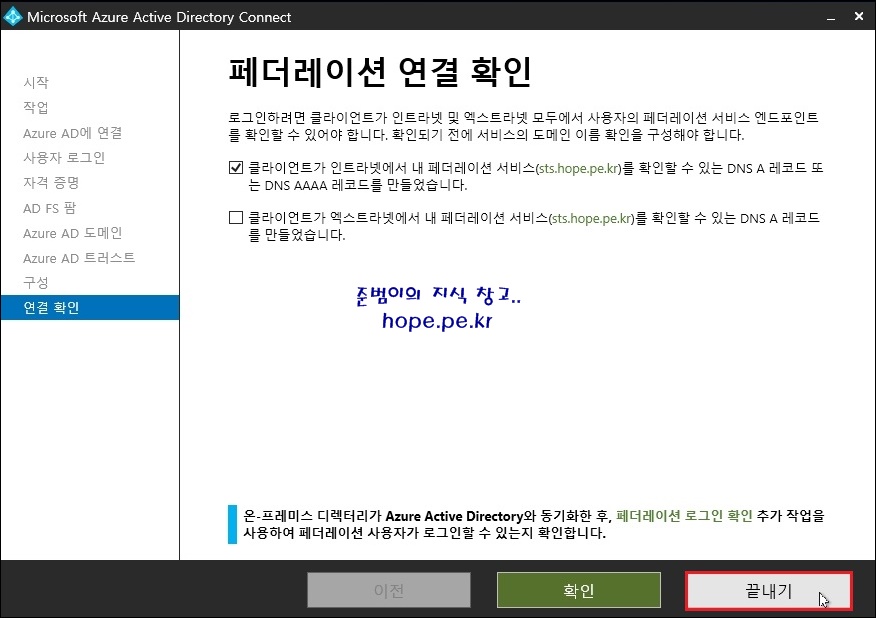 페더레이션 연결 확인 화면에서, '끝내기' 를 클릭 하면 Azure AD Connect 설치 마법사를 통해 사용자 로그인 방법을 'AD FS 페더레이션' 으로 구성하는 모든 과정이 정상적으로 완료 됩니다.
