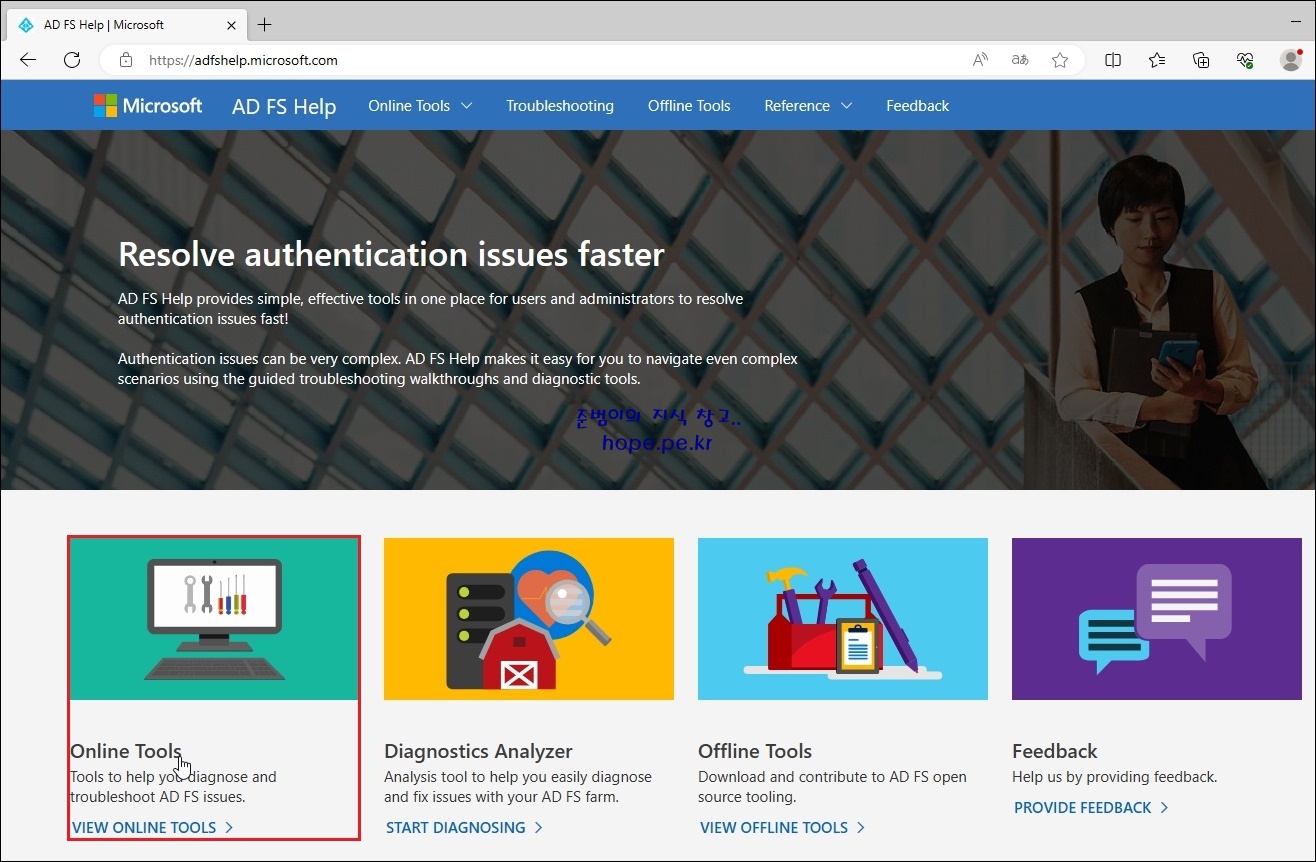 https://adfshelp.microsoft.com 사이트 접속 속 후 'Online Tools' 를 클릭 합니다.