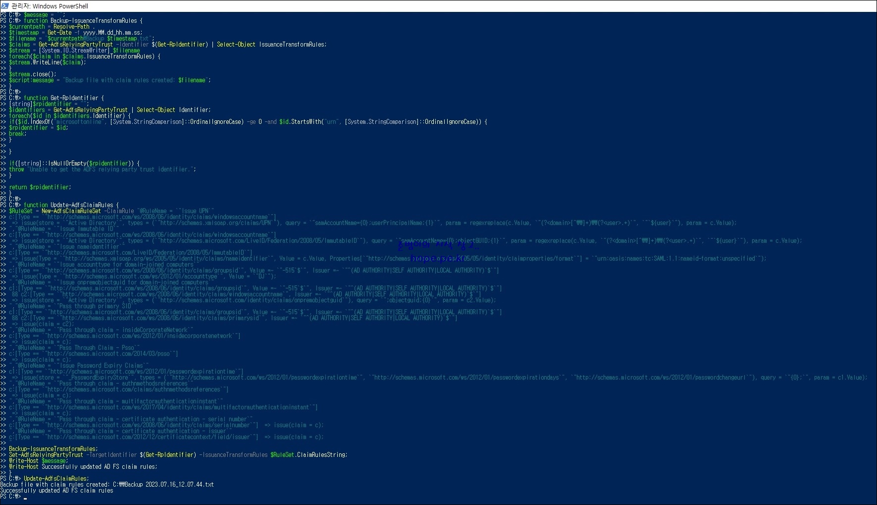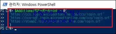 다음 스크립트를 복사 후 PowerShell에 붙여넣기를 진행하여, RPT에 대한 추가 WS-Fed 엔드포인트를 정의합니다.