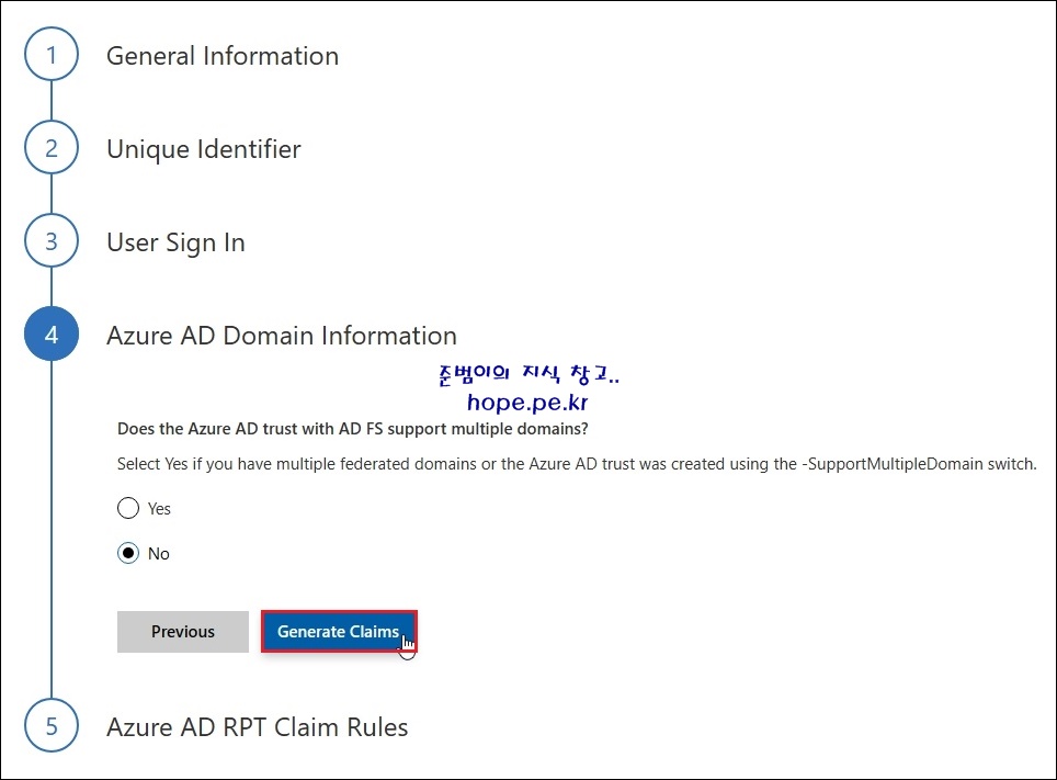 4) Azure AD Domain Information 단계에서, 조직에 여러 페더레이션 도메인이 있거나 -SupportMultipleDomain 스위치를 사용하여 Azure AD 트러스트를 만든 경우에는 'Yes' 를 선택 / 아닐 경우에는 'No' 선택 후 'Generate Claims' 를 클릭 합니다.