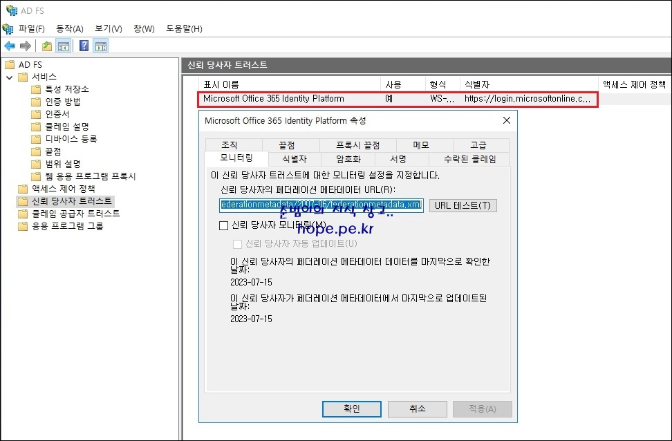 AD FS 콘솔의 신뢰 당사자 트러스트에, Microsoft 365가 정상적으로 추가됨을 확인 합니다.