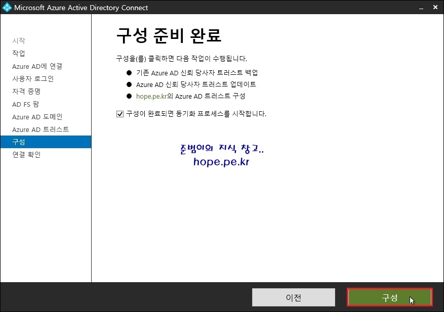 구성 완료 화면에서, 'Azure AD Connect가 AAD 신뢰 당사자 트러스트를 만들거나 업데이트 할 수 없습니다. 자세한 내용은 로그 파일을 확인한 다음 작업을 실행하여 트러스트를 다시 설정하세요. 경고 메세지가 발생하는 경우가 있습니다.