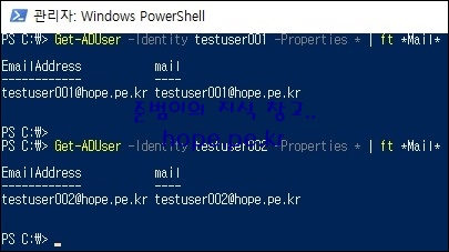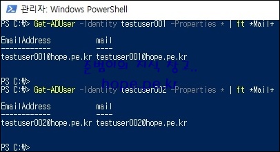 PowerShell을 관리자 권한으로 실행 후, 다음 cmdlet을 실행하여 특정 사용자의 EmailAddress 속성값이 존재함을 확인합니다.