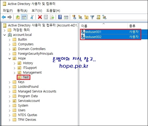일부 사용자의 삭제 작업은 'Active Directory 사용자 및 컴퓨터' 콘솔에서 진행하면 됩니다.