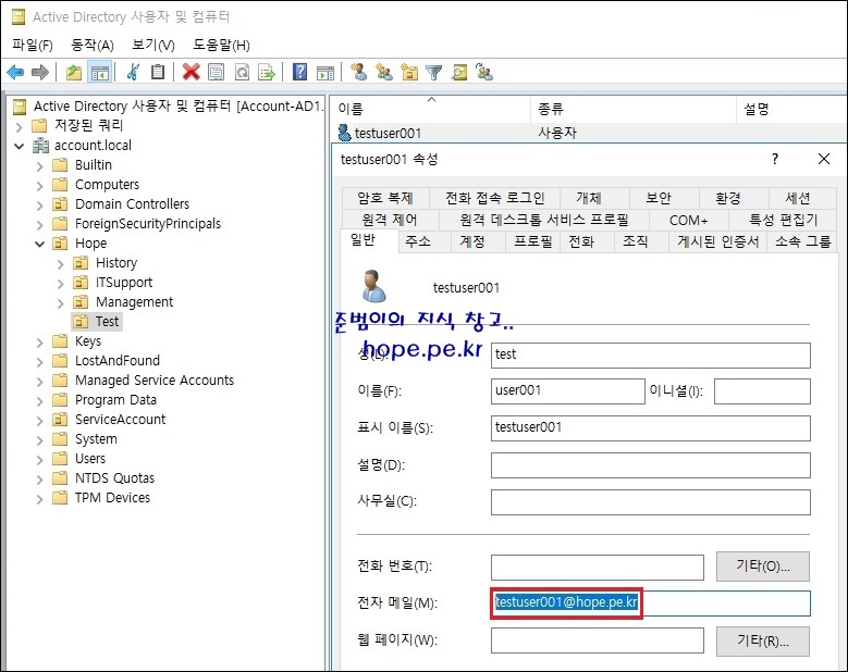'Active Directory 사용자 및 컴퓨터' 콘솔의 사용자 속성 창에서도 '전자 메일' 속성이 정상 삭제되었음을 확인 합니다.