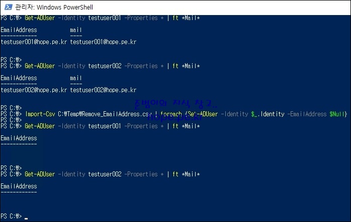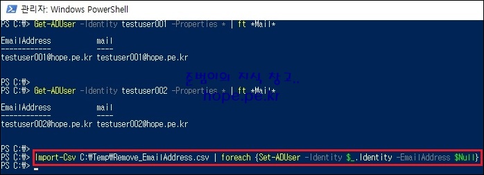 다음 cmdlet을 실행하여, 해당 CSV 파일내 사용자들의 EmailAddress 속성값을 삭제 합니다.