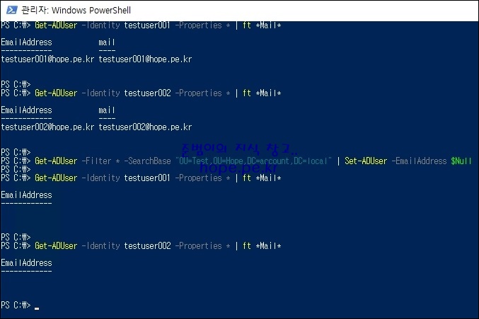 이상으로 "PowerShell로 Active Directory 사용자의 EmailAddress 속성 삭제 방법" 에 대해 알아보았습니다.