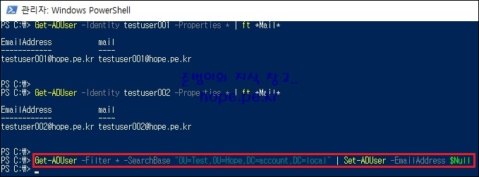 다음 cmdlet을 실행하여, 해당 OU내 사용자들의 EmailAddress 속성값을 삭제 합니다.