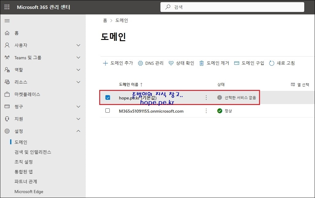 Microsoft 365 관리 센터에서 소유하고 있는 도메인 hope.pe.kr을 추가 하였습니다.