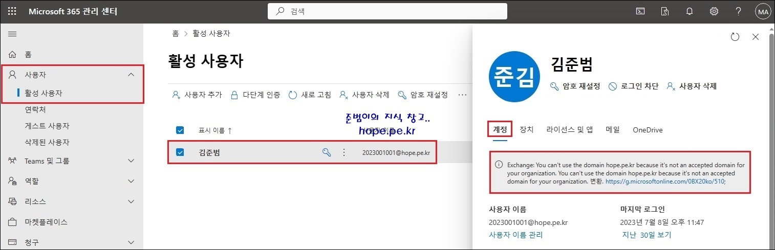 Exchange: You can't use the domain '도메인 이름' because it's not an accepted domain for your organization.