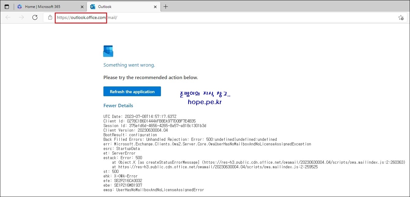 그리고 실제 해당 사용자의 메일 페이지(https://outlook.office.com)에 접속을 해보면 아래와 같이 에러 메세지가 발생합니다.