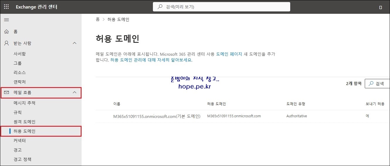 Exchange 관리 센터로 이동 후 '메을 흐름 > 허용 도메인' 메뉴에서 추가된 허용 도메인을 확인해봤습니다. Microsoft 365 관리 센터에서 추가했던 hope.pe.kr 도메인이 허용 도메인 목록에 추가가 안되어 있네요? 왓더?