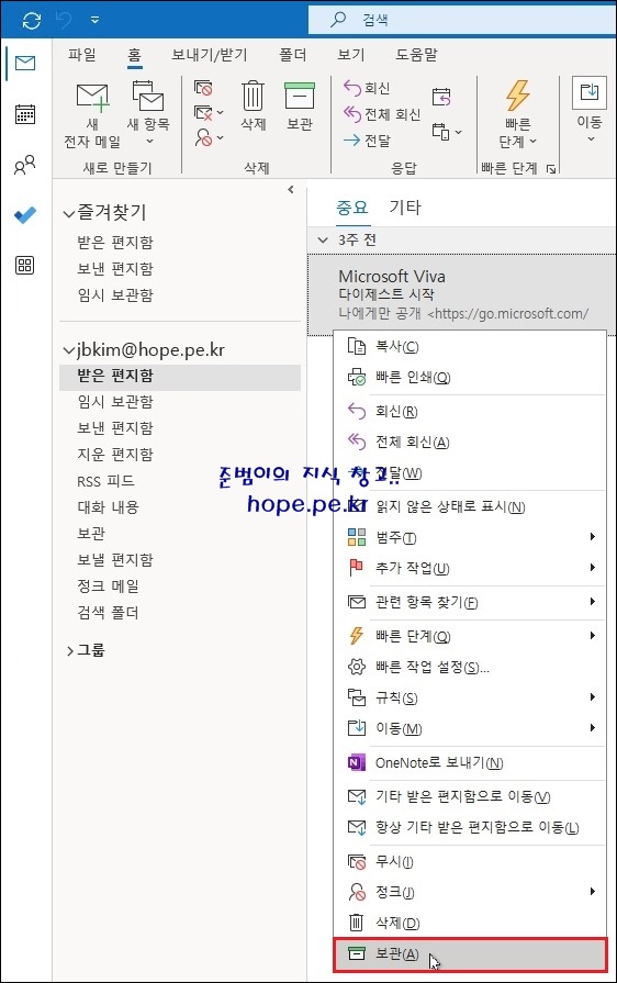 특정 메일에서 우클릭 후 '보관' 을 클릭 하면