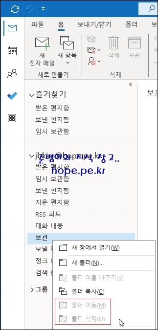 '보관' 폴더에서 우클릭을 해보면 받은 편지함과 동일하게 폴더 이동 및 폴더 삭제 메뉴가 비활성화 되어 있습니다.