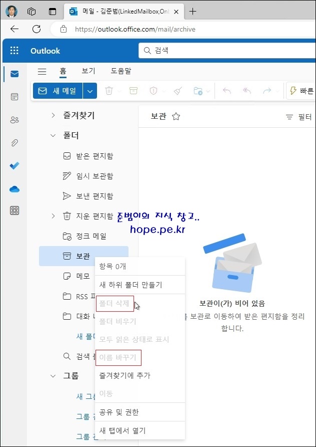 cf) outlook.office.com의 보관 폴더에서 우클릭을 하면 역시 폴더 삭제 메뉴가 비활성화 되어 있습니다. Outlook과는 다르게 이름 바꾸기 메뉴를 확인할 수 있으며 역시 비활성화 되어 있습니다.