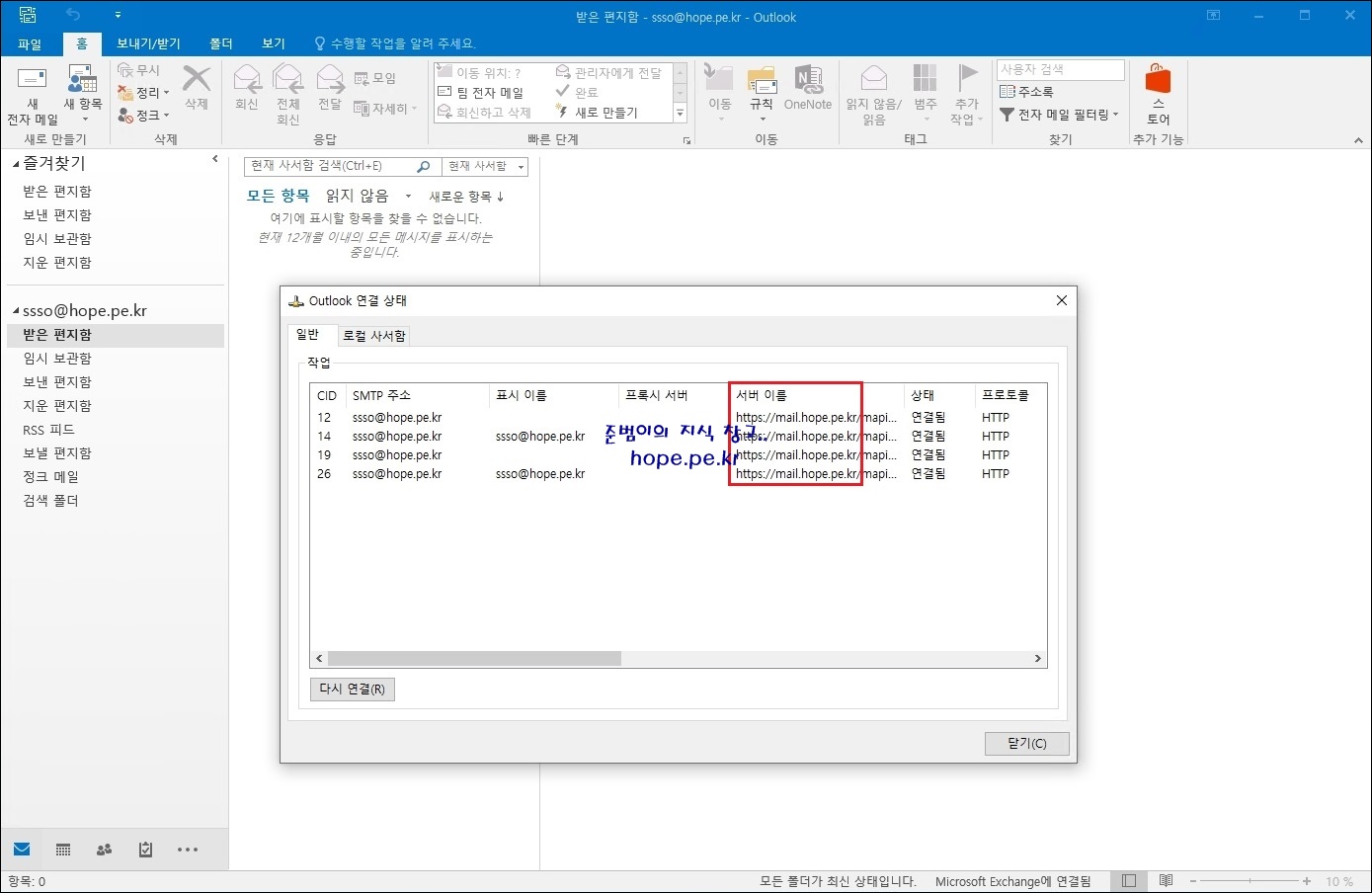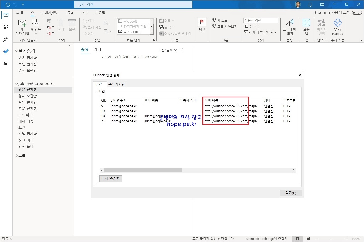 jbkim@hope.pe.kr 사서함은 'Outlook 연결 상태' 창의 '서버 이름'에서 알 수 있듯이, Exchange Online 사서함 입니다.